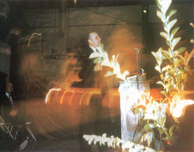 В 1958 году на территории ярмарочной площади города Лейкпорт, штат Калифорния, Бог снова устроил всё необходимое для съёмки Его сверхъестественного Света. Во время проповеди один фотограф с первоклассным оборудованием сделал два цветных снимка Брата Бранхама. Первый кадр был обычным и содержал все детали сцены: кафедру, микрофон, проповедующего Брата Бранхама, электрощит на стене и большую композицию из лилий перед кафедрой. (Фото №14) Второй кадр, сделанный с того же места, также содержал все эти детали, но это не была обычная фотография. Эта фотография содержала много дополнительных деталей, которых не видели присутствующие. (Фото №15) За Братом Бранхамом (над его головой) располагается полный профиль лица, описать которое можно только как профиль Иисуса Христа. На фотографии также присутствует сверхъестественный жертвенник и семь языков пламени, о которых говорится в Откровении как о “семи Духах Божьих”, которые “пред престолом”. Лилии, похоже, выросли в размере; на этой фотографии они возвышаются над головой Брата Бранхама (Христос — Лилия Долины). На фотографии также виден Ангел Господень с исходящим от него шлейфом огня, который окутывает Брата Бранхама. С кончиков пальцев Ангела исходят язычки пламени. При внимательном рассмотрении видно, что Ангел напоминает Брата Бранхама. (Позже, когда Брату Бранхаму явилось созвездие Ангелов, он говорил, что в нижней левой части фотографии этого облака был тот Ангел, который всегда являлся ему, потому что он как будто узнал его. Ничего удивительного, если задуматься, что эти семь посланников, семь духов, семь звёзд, будучи семью посланниками периодам церкви, напоминают мужей, к которым они посылались.) Описание этого Ангела обнаруживает тот же самый внешний вид, который описывал Иезекииль, потому что от чресл и ниже у Ангела огонь, а от чресл и выше — янтарный свет. В Ветхом Завете это называется славой Божьей. Но сейчас, в этом поколении, нам не нужно просто верить кому-то на слово, что кто-то это видел, потому что Бог усмотрел для нас цветную фотографию, свидетельствующую о том, что Бог на самом деле есть Свет. И это тот же самый Столп Огненный, который был с Божьим пророком этого поколения и его посланием, так же как с Моисеем и его посланием.