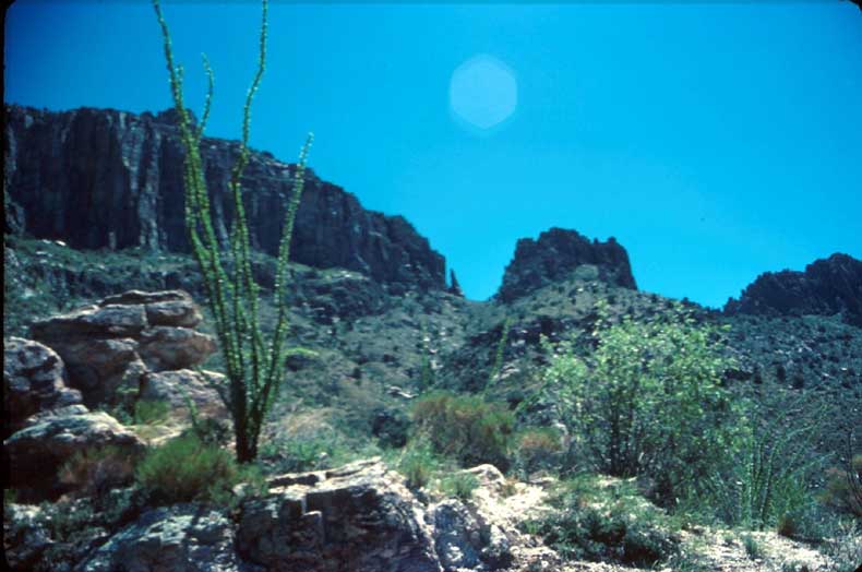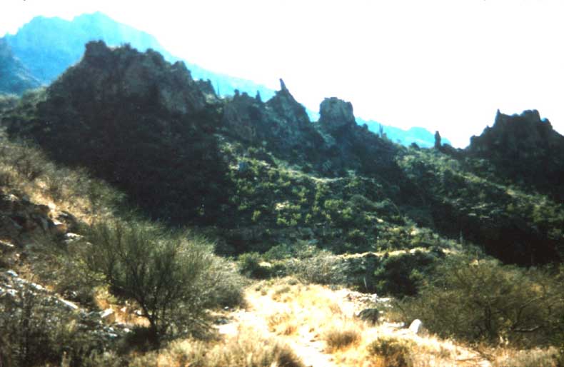 В тот день он прибыл к каньону около восьми тридцати утра, проехав как можно дальше, он отправился пешком. Справа от него, всё выше и выше, там, где летают орлы, возвышались огромные, массивные отвесные утёсы восточной стены каньона. Взбираясь по заброшенной дороге, а затем прямо вверх по наклонному утёсу, он оказался там, “где летают орлы”, а затем среди каких-то зубчатых скал. (Фото №18) Здесь он почувствовал присутствие Господа и склонился помолиться. Однажды, в августе 1965 года, он мне лично сказал, что просил у Бога показать ему значение всего этого, чтобы получить для себя ответ. Потом он продолжил рассказывать мне о том времени, когда у него был такой больной желудок, что из него выходила какая-то сальная, водянистая жидкость, ему помогали подняться на платформу, однако когда его руки возлагали на людей, изъеденных раком, рак исчезал. Казалось, что дар был для всех, кроме него самого. Он рассказывал, что целый год Бог отвращал Свой лик от пророка, испытывая и проверяя его. Итак, вот он стоял там в то утро, высоко в Каньоне Сабино, отчаянно прося у Бога дать ему ответ, подняв свои руки к Всемогущему Богу, когда солнце как раз показалось на дне седловины (Фото №19) между остроконечными вершинами, и внезапно в его руке оказалась рукоятка меча.